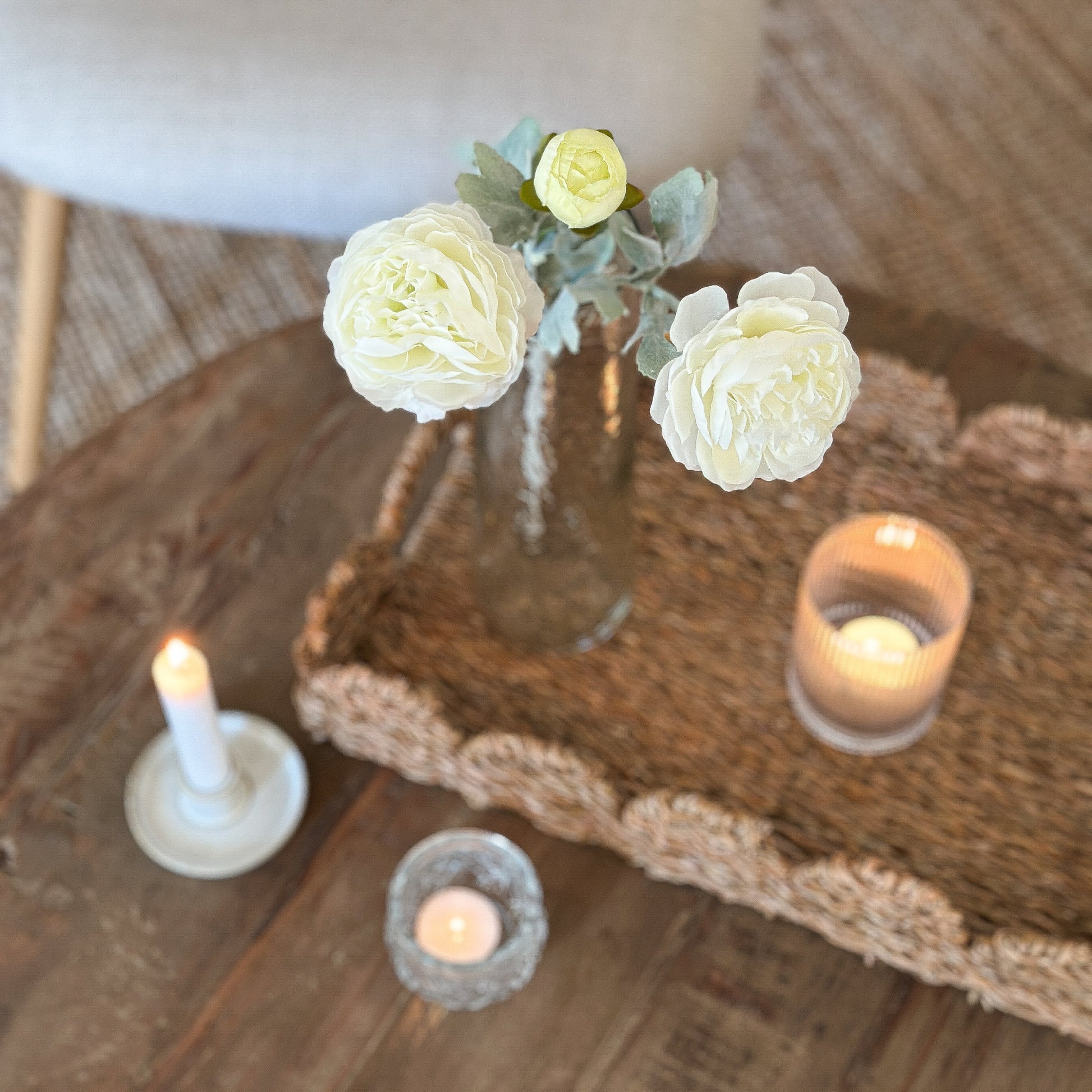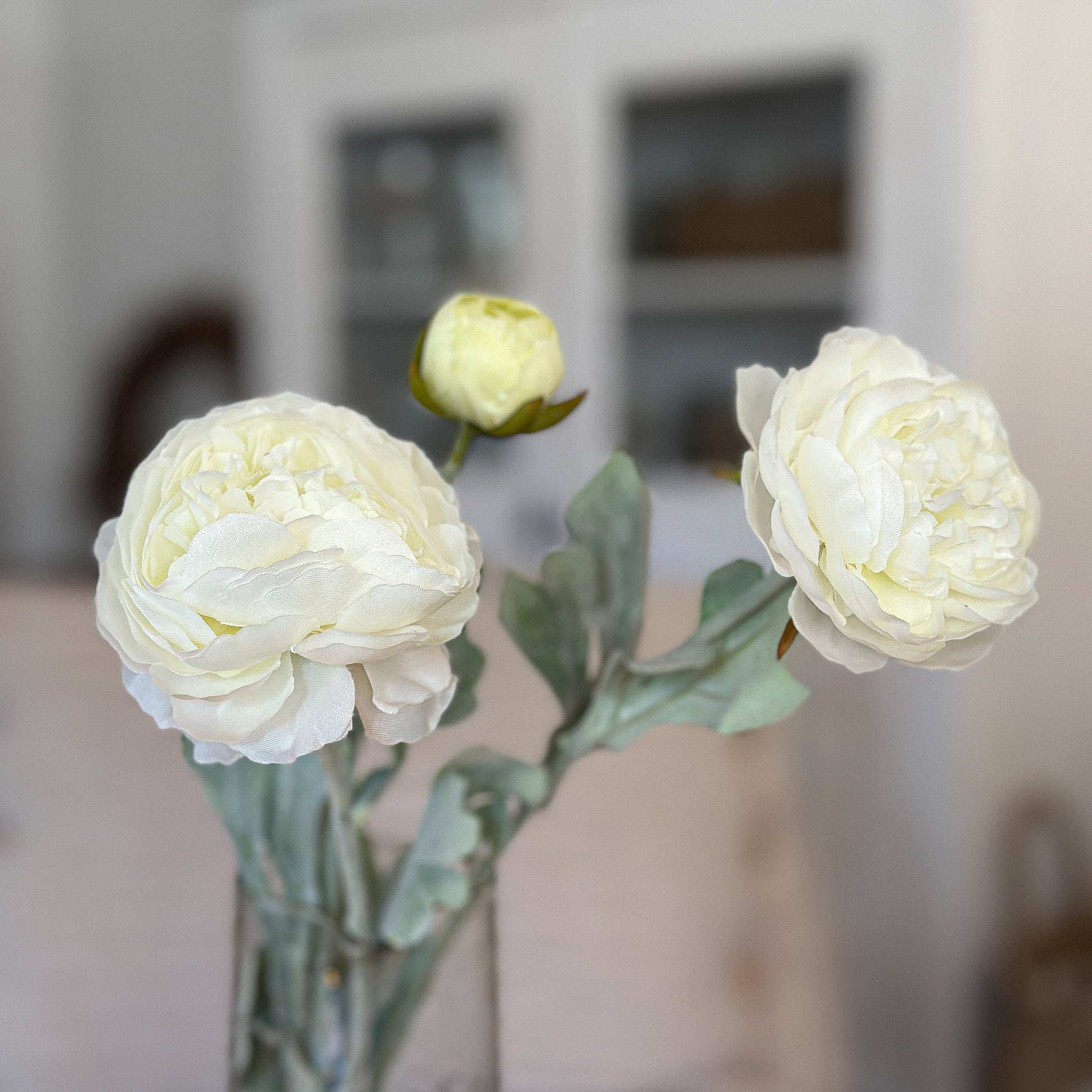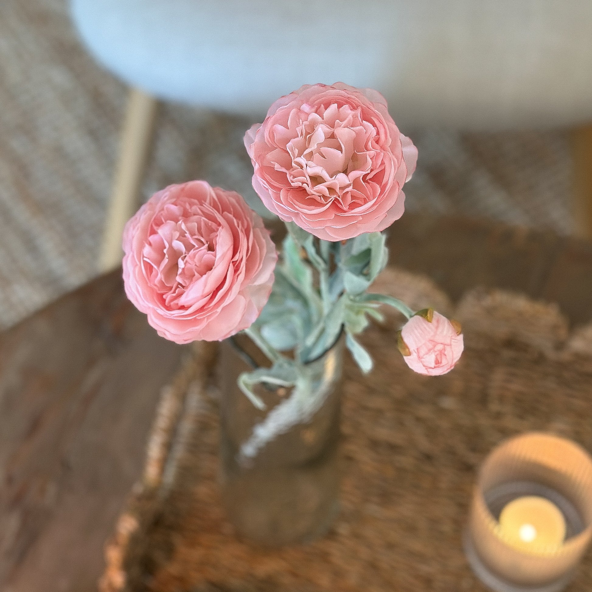 Mit drei liebevoll gearbeiteten Blüten pro Stiel – zwei geöffnet, eine Knospe – bringt sie natürliche Leichtigkeit in deine Vase. Ob in Cremeweiß für einen eleganten, ruhigen Look oder in zartem Rosé für einen Hauch von Frühlingsromantik – diese Ranunkel schenkt dir dauerhafte Blütenfreude, ganz ohne Welken.