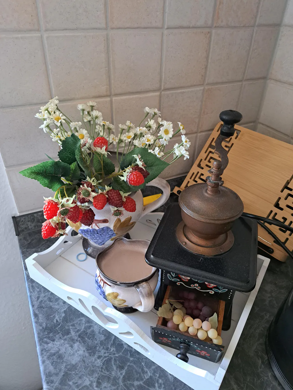 Ich bräuchte einen Strauß für die Küche und hätte nicht gedacht, das er mir so gut gefällt. Ich habe ihn mit ein paar Himbeeren im Krug dekoriert.