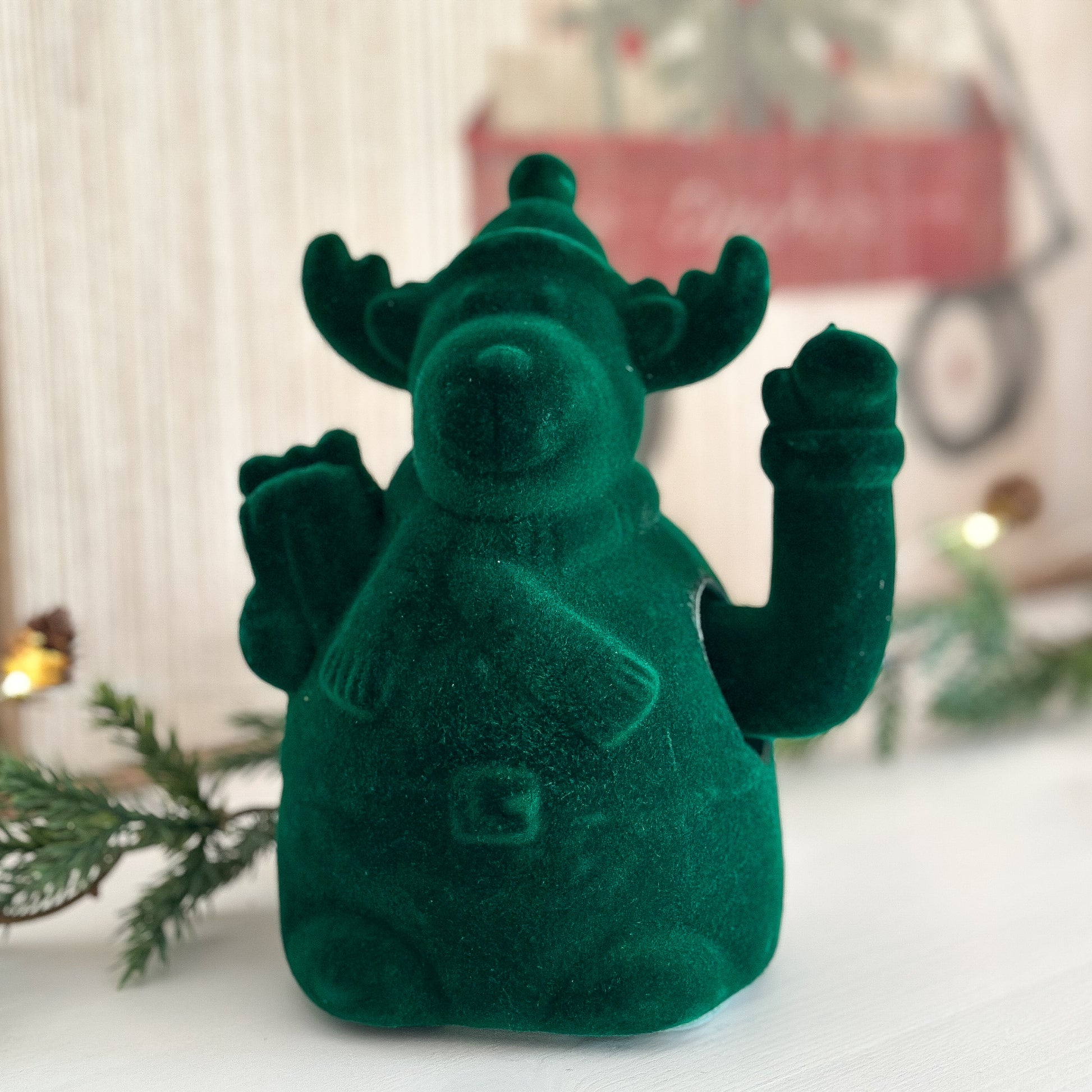 Mit einem fröhlichen Winken begrüßt dieser charmante Elch alle Gäste und zaubert sofort ein Lächeln ins Gesicht. Der samtige, moosgrüne Überzug lässt ihn besonders weich und freundlich wirken – perfekt für Deine winterliche Dekoration. Ob auf dem Fensterbrett, dem Sideboard oder mitten im Adventskranz: Der Winke Elch verbreitet eine gemütliche Stimmung und sorgt für ein liebevolles Detail in Deinem Zuhause. Ganz ohne Kabel, aber mit ganz viel Herz!