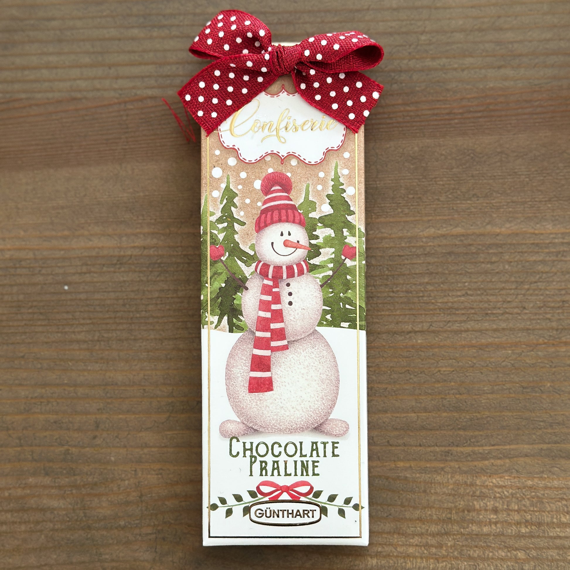 Wenn Schneemann und Weihnachtsmann gemeinsam Schokolade bringen, ist Weihnachten nicht mehr weit! Dieses festlich verzierte Präsent verzaubert mit zarten Schokoladentäfelchen, gefüllt mit feiner Nougatcreme – liebevoll verpackt, mit nostalgischem Charme und roter Schleife. Perfekt als kleines Mitbringsel, für den Nikolausstiefel oder als süße Tischdeko zur Adventszeit.