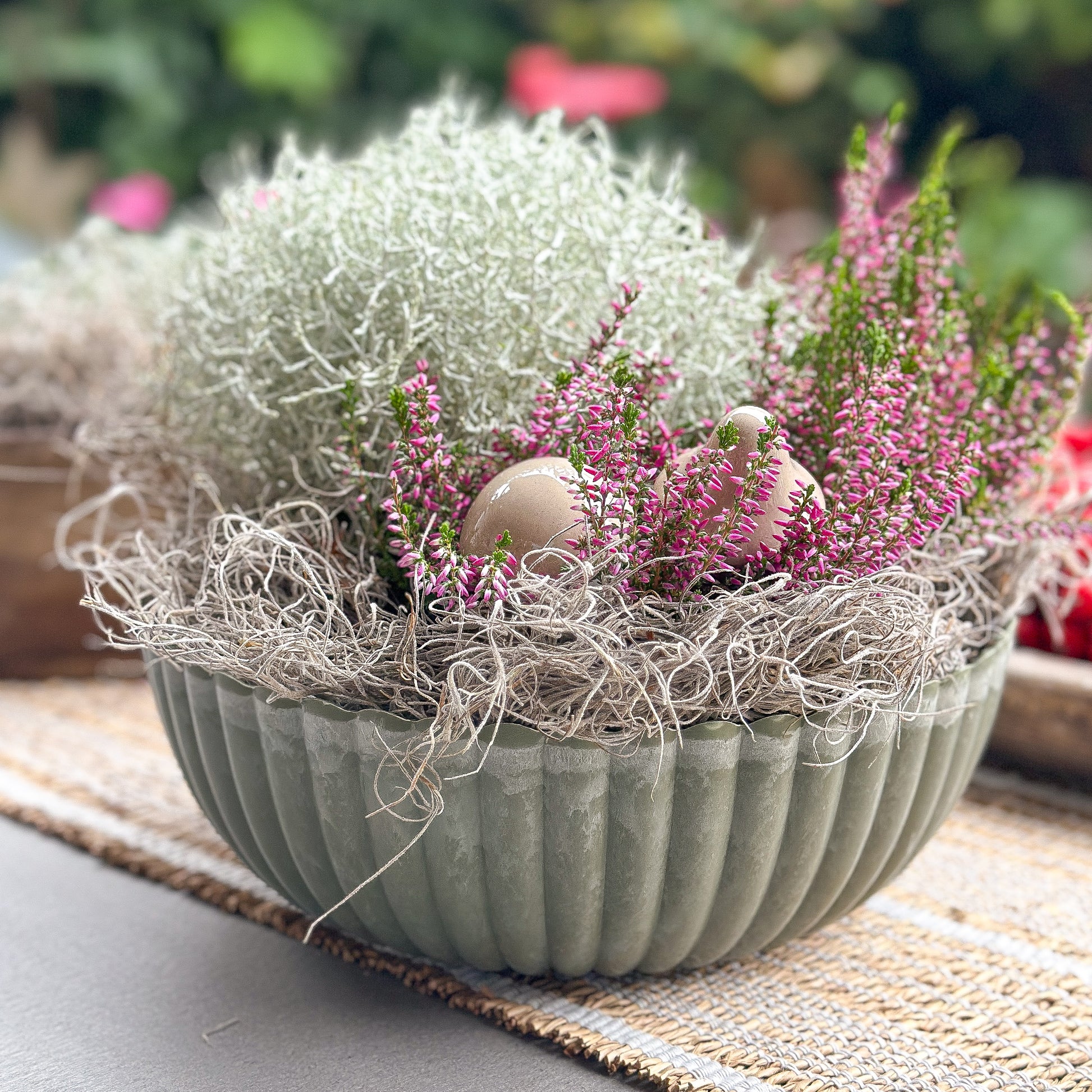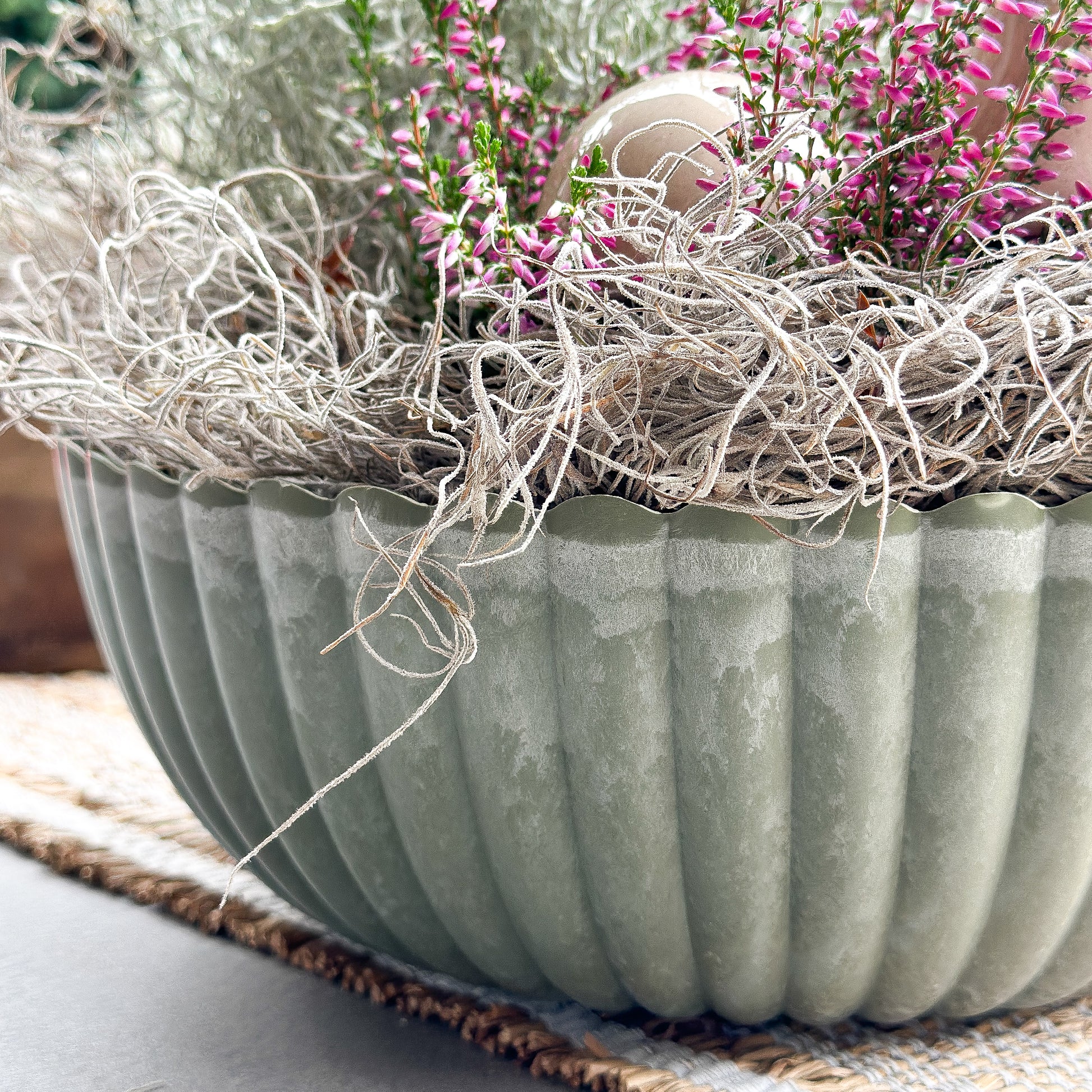 Diese geriffelte Schale in zartem Grün vereint Nachhaltigkeit mit modernem Landhaus-Charme. Ob für Trockenblumen, Nüsse oder als Basis für Deine individuelle Herbstdeko – sie ist vielseitig einsetzbar und dabei federleicht und robust.