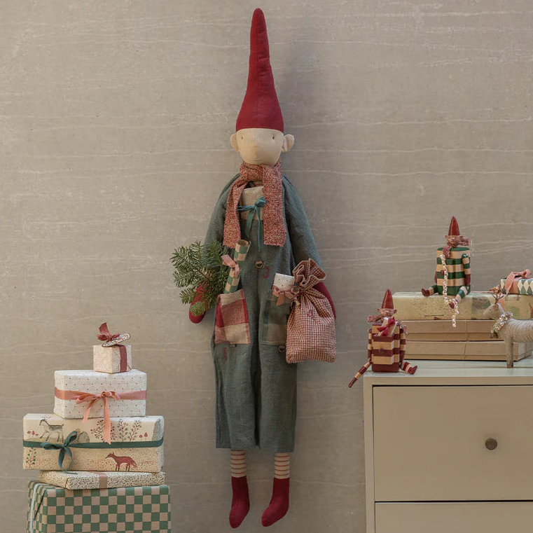 Dieser bezaubernde Weihnachtswichtel aus der Maileg Pixy Collection ist nicht nur ein Blickfang, sondern auch ein Teil deiner schönsten Weihnachtstraditionen. Mit seiner langen Zipfelmütze, dem grauen Einteiler mit liebevoll aufgenähten Stofffeldern und der rot melierten Schal-Schleife erinnert er an nostalgische Adventstage. Das Besondere: Er trägt vier kleine Taschen und Ringe, an denen du kleine Aufmerksamkeiten für die vier Adventssonntage befestigen kannst. Ein detailverliebter Begleiter, der Jahr für Jahr Freude schenkt und Kinderaugen leuchten lässt.